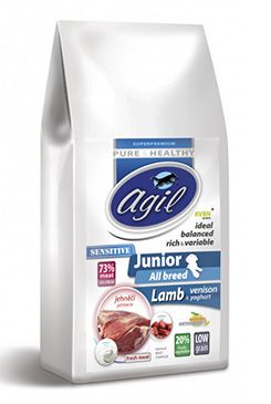 Skladem Agil Junior All Breed Sensitive GF Lamb&Venison 10kg PeMi kód: 719906 EAN: 8594037021609 Kompletní superpremiové krmivo bez obilovin pro štěňata všech plemen, s jehněčím masem, zvěřinou a jogurtem. SLOŽENÍ: Jehněčí 45% (čerstvé 10%, masová jehněčí moučka 35%), brambory, zvěřina 25% (čerstvé 15%, zvěřinová moučka 6%), hrách, domácí ovoce (čerstvé, sušené, ovocný extrakt) – 991 Kč Do košíku