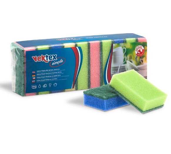 • Vektex Simple Houbičky na nádobí 10 ks Polyuretanová houbička na nádobí se zelenou abrazivní vrstvou. Rozměr houbičky 8 x 5 x 2,4 cm. Houbička vhodná pro mytí veškerého nádobí v domácnosti. Balení obsahuje 10 ks.