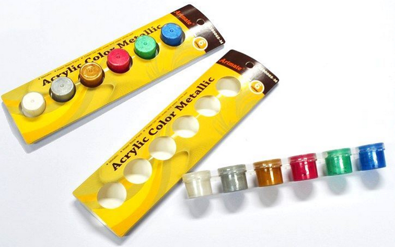 Vhodné pro malování na různé materiály. Široké použití a pestré barvy. Vhodné na dřevo, keramiku, sklo, papír, plasty atd. Vodou ředitelné a omyvatelné. Barvy je možné vzájemně míchat k rozšíření barevné palety. Balení obsahuje i štětec, 4 ml / 12 ks.