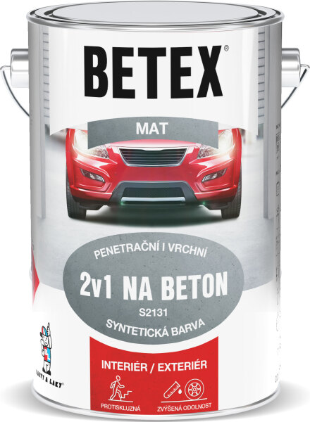 Skladem Betex S2131 2v1 základní i vrchní barva na beton 0110 šedá, 5 kg PeMi kód: 107332 EAN: 8591235039481 Barva BETEX S2131 2v1 je určená k aplikaci na beton. Vhodná k ošetření podlah garáží, na schody, sklepy, balkony, terasy, zdivo, OSB desky. Dlouhodobě odolává vlhku a povětrnostním vlivům, olejům, roztokům solí, slabým kyselinám a zásadám, krátkodobě motorové naftě 1 194 Kč Do košíku