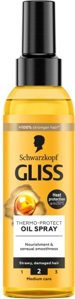 Skladem Gliss termoochranný olejový sprej na vlasy 150ml PeMi kód: 720893 EAN: 9000101732436 Lehký a rychleschnoucí sprej s olejovou texturou, navržený k ochraně suchých a poškozených vlasů před horkem až do 230 °C, díky bohaté receptuře s omega-9 mastnými kyselinami a marulovým olejem. Hlavní přínosy Tepelná ochrana do 230 °C – ideální při fénování, žehlení i 284 Kč Do košíku