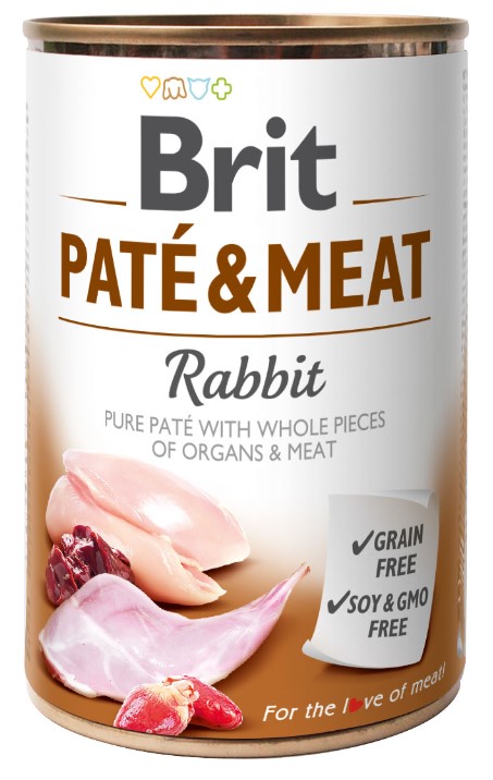 Superprémiová konzerva Brit obsahuje 70% králičího a kuřecího masového paté s celými kousky vnitřností (játra, srdce, plíce).