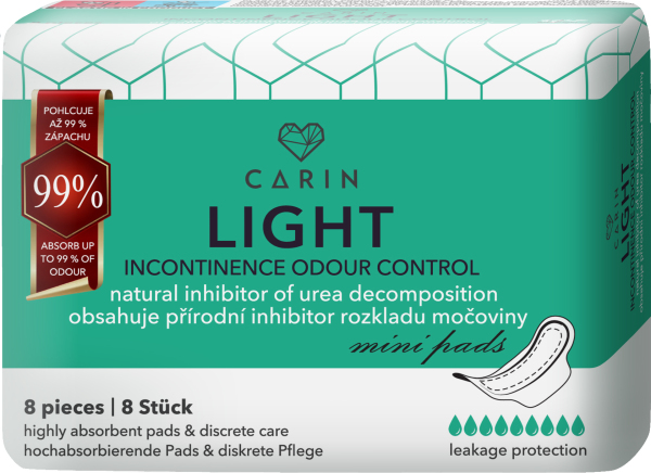 Skladem Carin Light Incontinence Odour Control 8ks PeMi kód: 720003 EAN: 8594004302359 Unikátní vysokoabsorpční, spolehlivé a diskrétní vložky s křidélky pro použití při lehkém úniku moči. Výrobek obsahuje přírodní inhibitor rozkladu močoviny, který výrazně snižuje uvolňování amoniaku (původce nechtěného zápachu moči ). Současně snižuje dráždivost pokožky a tvorbu vyrážky 41 Kč Do košíku