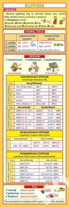 Skladem Český jazyk Slovesa záložka PeMi kód: 728931 EAN: 1118070605328 Záložka vysvětluje gramatické kategorie sloves, druhy sloves a slovesné tvary, osoba, číslo, způsob, čas, slovesný rod a vid, slovesné třídy a vzory, názorné ilustrace. 26 Kč Do košíku
