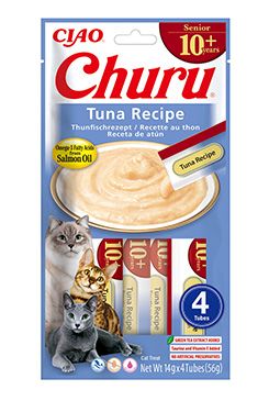 Skladem Churu Cat Senior 10+ Tuna Recipe 4x14g PeMi kód: 719128 EAN: 4262365731333 Tuňáková receptura. Churu Senior 10+ s tuňákem je lahodný, krémový pamlsek speciálně vyvinutý pro kočky nad 10 let. Obsahuje Omega - 3 mastné kyseliny pro podporu mozkové činnosti, vitamíny C a E pro imunitu a taurin pro zdravý zrak a srdce 54 Kč Do košíku