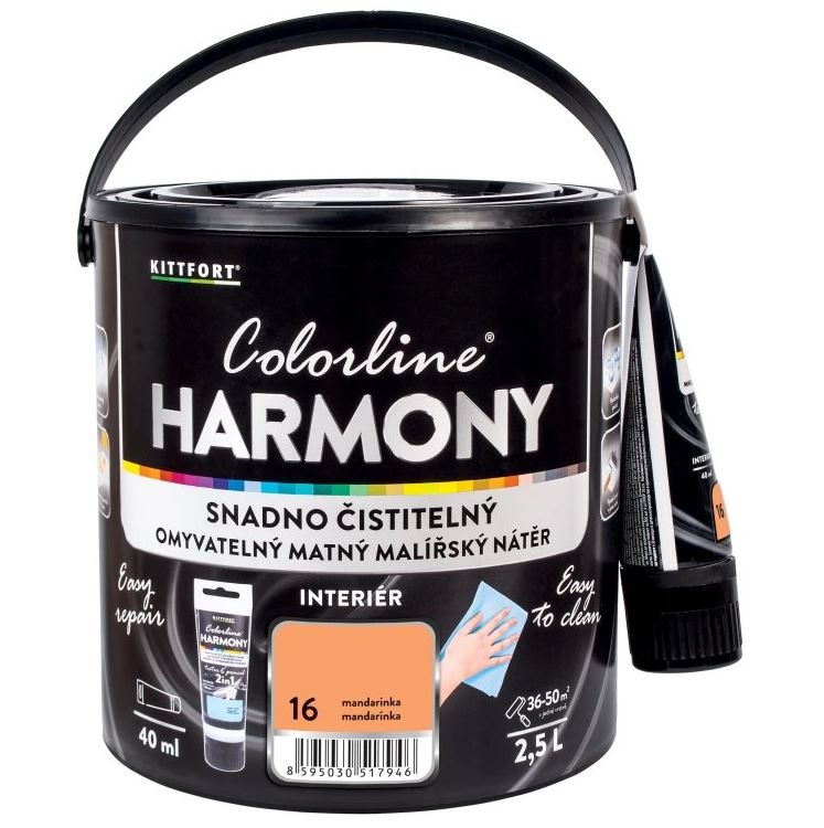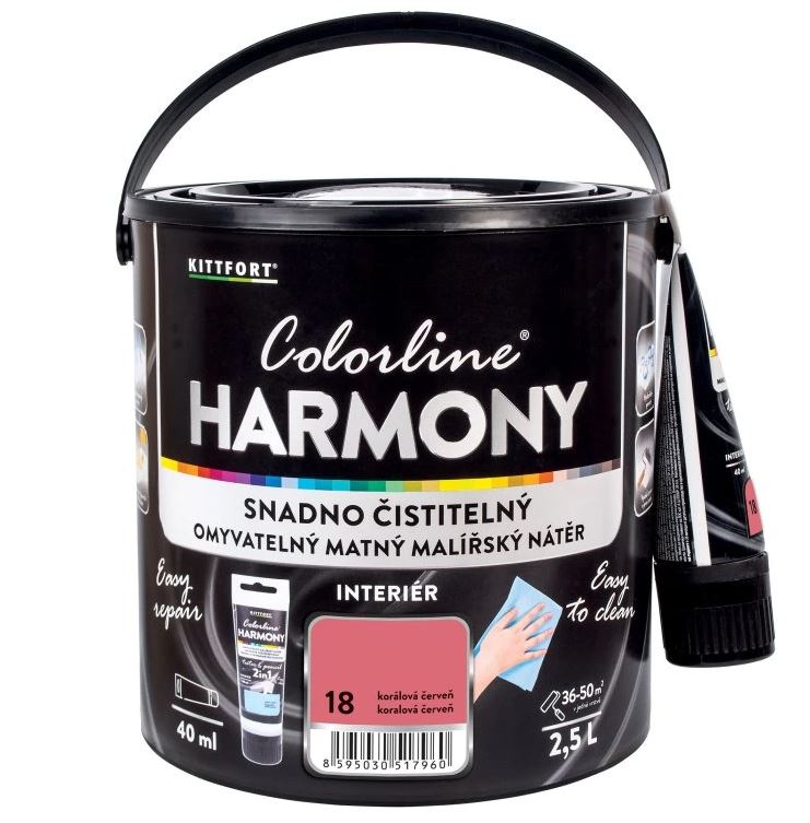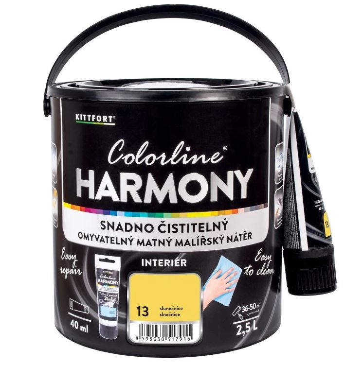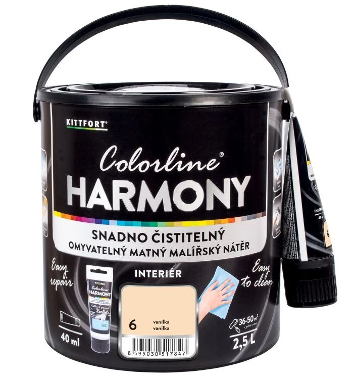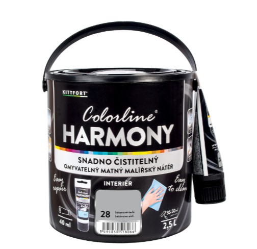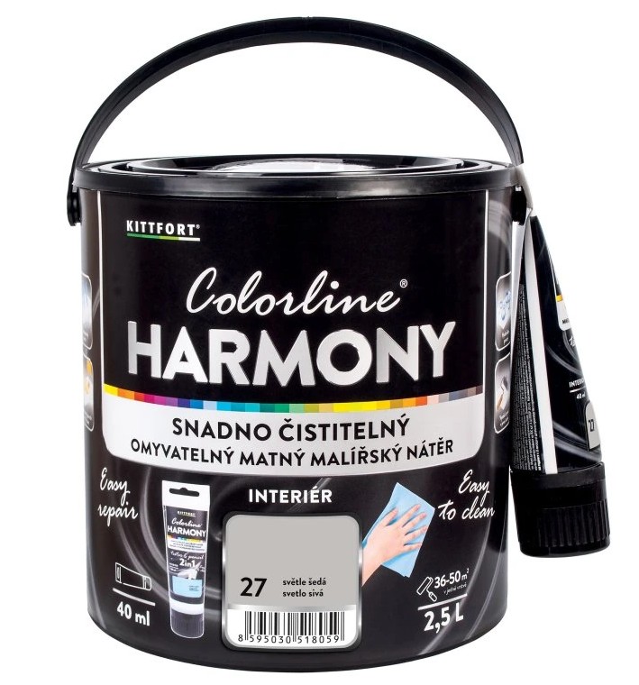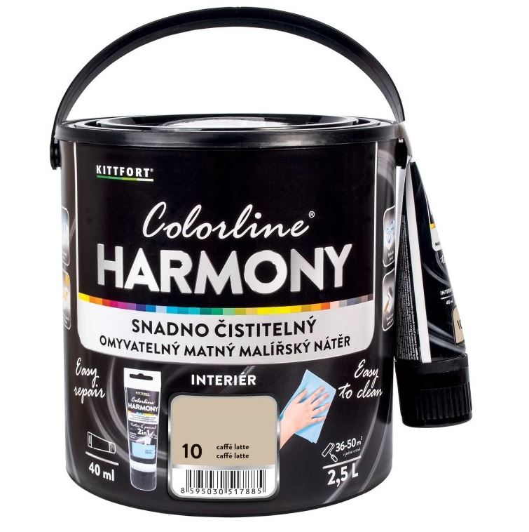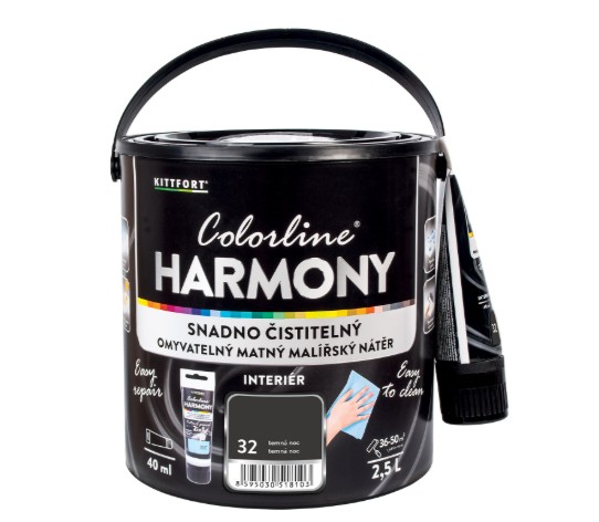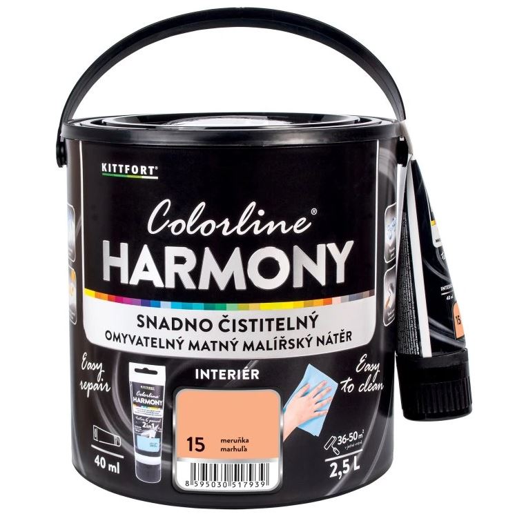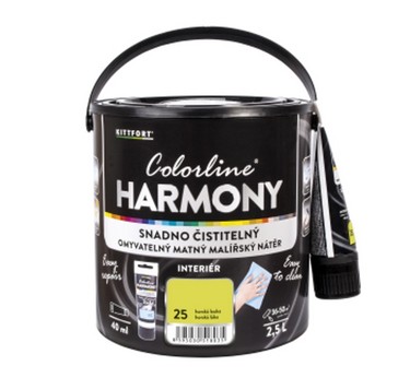 • Colorline® HARMONY je moderní, inovativní, extra odolný, matný, omyvatelný malířský nátěr s hydrofobními vlastnostmi, které zaručují odolnost vůči vodě, nečistotám a skvrnám. Zakoupením barvy Colorline® HARMONY máte od nás ZDARMA přiloženou na kbelíku opravnou tužku s aplikační houbičkou