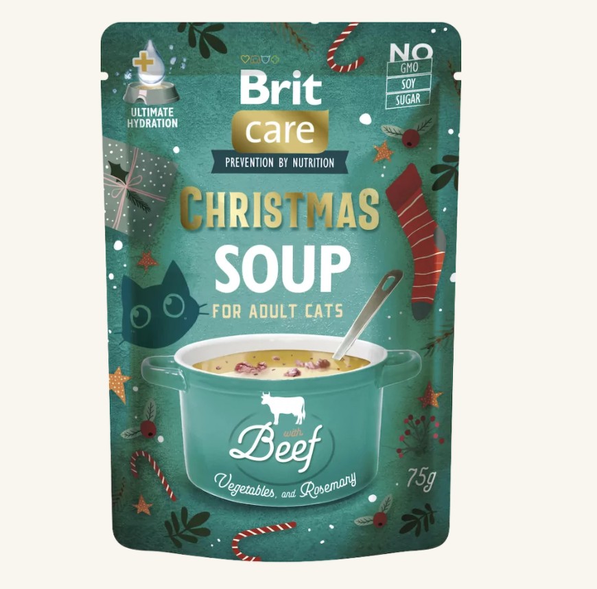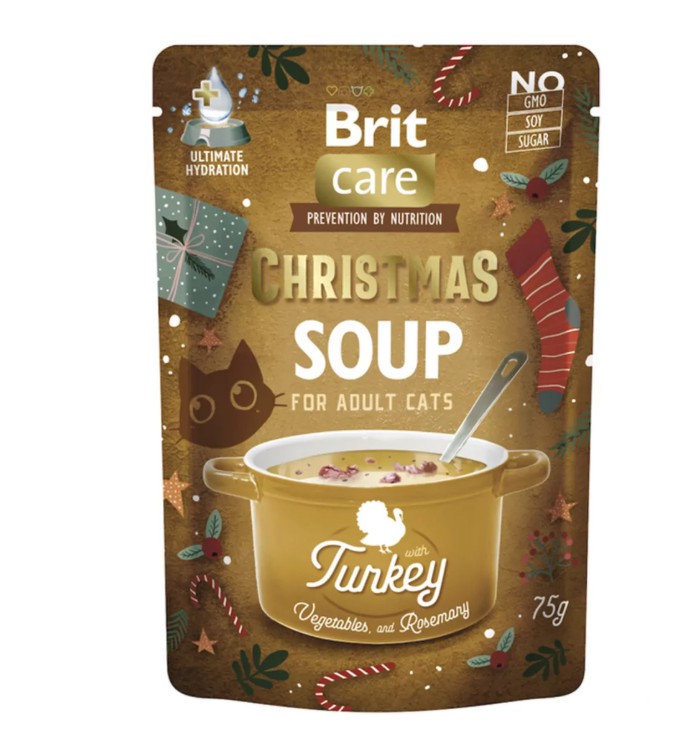 • Brit Care Cat Vánoční Polévka s rybou, zeleninou a rozmarýnem. Doplňkové mokré krmivo pro dospělé kočky ve vánočním limitovaném vzhledu. KRÁSNÉ VÁNOČNÍ BALENÍ ZVYŠUJE HYDRATACI VHODNÉ JAKO TOPPER NA GRANULE Polévka pro kočky s vánočním vizuálem s příchutí ryby je limitovaná edice