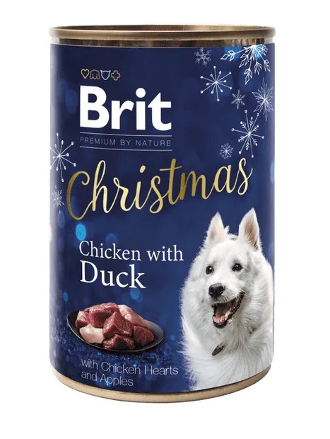 • Brit Premium by Nature Vánoční konzerva pro psy 400 g - vánoční konzerva s kachnou, kuřecími srdíčky a jablky pro dospělé psy všech plemen Receptura je nutričně vyvážená a přirozeně chutná, ideální pro zpestření sváteční stravy dospělých psů
