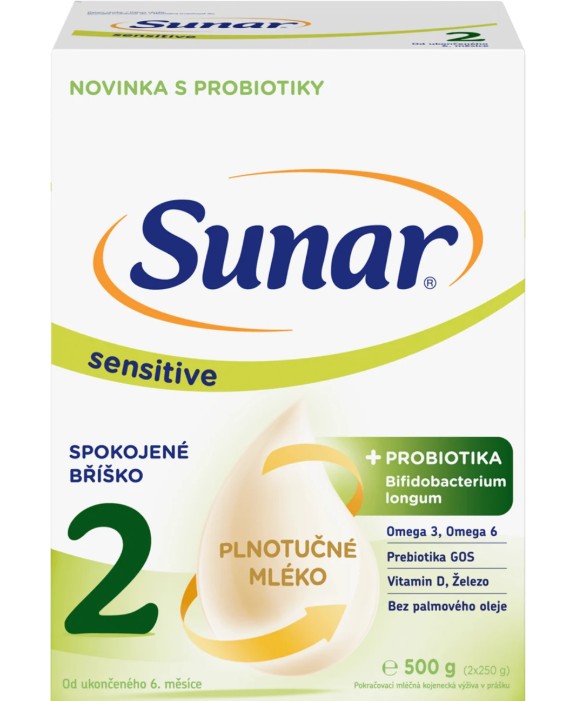Skladem Sunar Sensitive 500g 2 6m+ PeMi kód: 719215 EAN: 8592084420208 Sunar pokračovací mléčná kojenecká výživa 2 od ukončeného 6. měsíce je určena pro citlivé bříško vašeho děťátka. Jedná se o unikátní recepturu podle vzoru mateřského mléka s obsahem prebiotik (Oligosacharidy GOS) a probiotik (Bifidobacterium longum) 369 Kč Do košíku