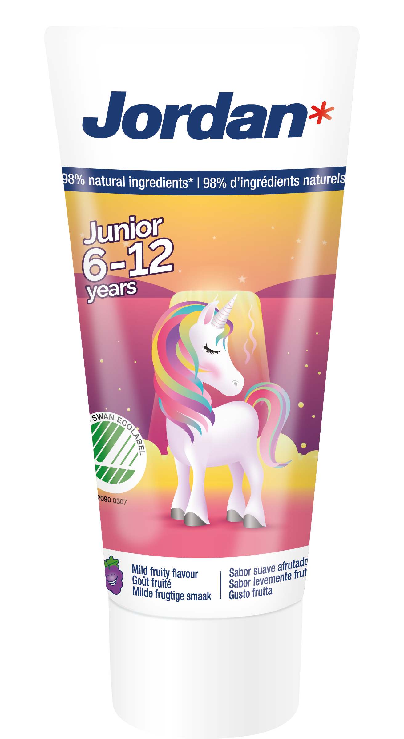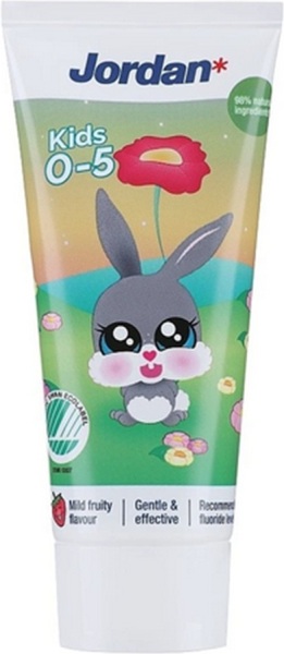 • Jordan Kids je zubní pasta určená pro děti od narození do 5 let. Obsahuje 500 ppm fluoridu, který pomáhá chránit a posilovat mléčné zuby.