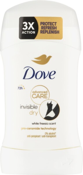 • Dove tuhý antiperspirant Advanced Care Invisible Dry spolehlivě pohlcuje pot a eliminuje zápach, čímž vám každý den zajistí pocit svěžesti a čistoty. Klíčové vlastnosti: účinně zabraňuje nadměrnému pocení chrání pokožku před vznikem nepříjemného zápachu