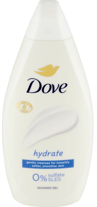 • Dove hydrate sprchový gel poskytuje exkluzivní péči o pokožku díky jemným hydratačním a čistícím složkám. Tajemstvím receptury sprchových gelů Dove je obsah hydratačních složek, které se přirozeně vyskytují v pokožce a rychle se vstřebají