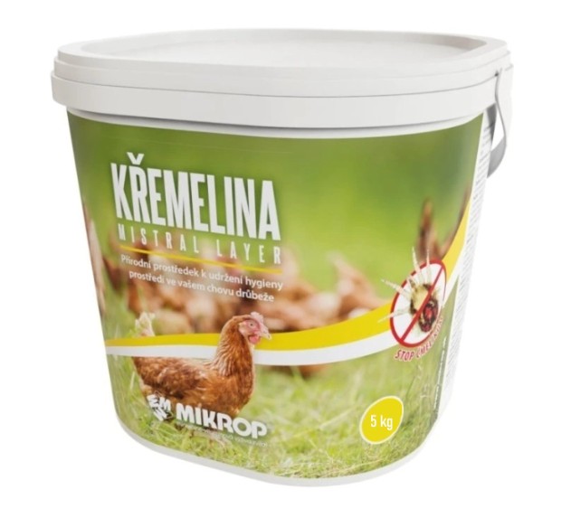 Skladem Mikrop Mistral Layer (Křemelina) 5kg PeMi kód: 722011 EAN: 8594038411775 Přírodní prostředek k udržení správné hygieny prostředí a zamezení výskytu čmelíka kuřího v chovech drůbeže. Křemelina se specifickou frakcí obohacená o esenciální oleje, určená speciálně pro potlačení výskytu roztočů v chovech drůbeže 876 Kč Do košíku