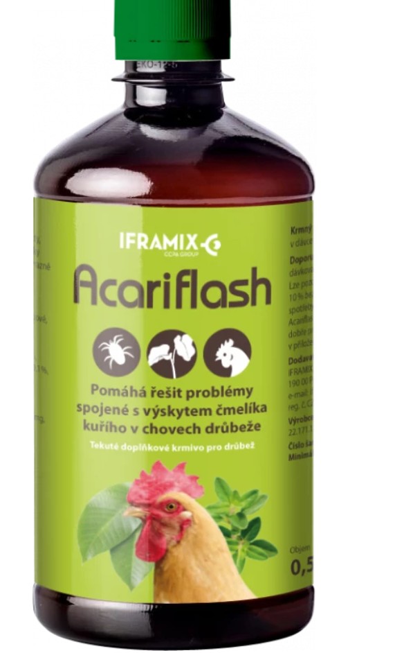 Skladem Acariflash 500ml PeMi kód: 731694 EAN: 0792649401545 Přípravek proti čmelíkům Acariflash je přírodní tekuté doplňkové krmivo pro drůbež, na bázi výtažků z rostlin, které jsou čmelíkům nepříjemné a odpuzující. Jedná se o přírodní řešení v boji proti čmelíkům. U čmelíků způsobuje snížený příjem krve a významně tak snižuje jejich rozmnožovací 374 Kč Do košíku