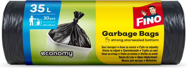 • Fino Economy pytle na odpadky 49 x 60 cm 35 l 8 µm 30 kusů Jedná se o základní řadu pytlů Fino bez zatahovací pásky. Černé neprůhledné barvy s výrazným značením objemu. Rozměry: 49 x 60 cm. Objem: 35 l. Tloušťka materiálu: 8 µm 30 kusů. Černá barva.