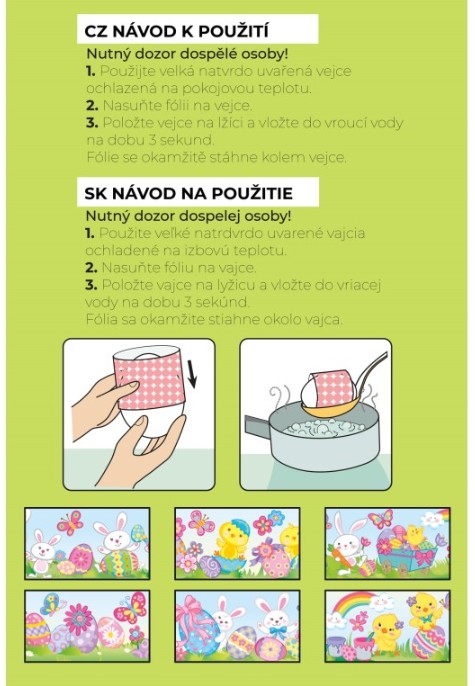 Dekorační fólie na velikonoční vejce s veselými motivy zvířátek, určená pro větší velikost vajíček. Balení obsahuje 12 kusů fólií o rozměru 210×155 mm, dodávaných v barevném mixu, jednotlivé motivy se mohou lišit. Fólie jsou vhodné pro rychlé a snadné zdobení velikonočních vajec. Stačí fólii navléknout na vejce a krátce ponořit do horké vody. Díky barevným a hravým motivům jsou ideální pro velikonoční výzdobu i tvoření s dětmi. Zboží je dodáváno v mixu. Doručované zboží je vybíráno náhodně a nelze vybrat konkrétní provedení.