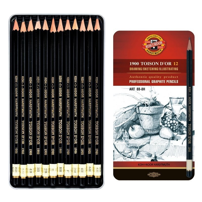 Skladem Sada grafitových tužek KOH-I-NOOR Toison D´´or 1902 PeMi kód: 679893 EAN: 8593539179238 Tužky Koh-i-noor 1902 / 12 grafitová sada TOISON D'OR, rozsah tvrdosti 8B-8H, souprava 12-ti grafitových tužek v plechovém obalu, vhodných pro umělecké, grafické i technické kreslení. 252 Kč Do košíku