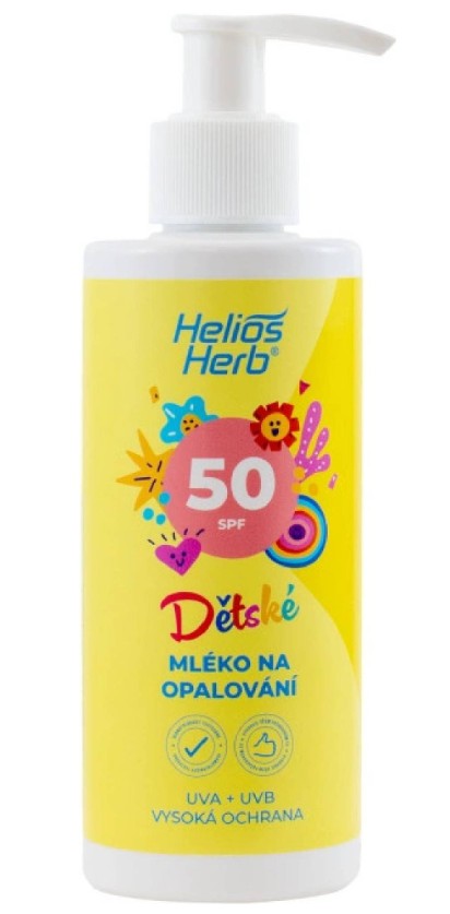• Helios Herb Dětské mléko na opalování s ochranným faktorem 50 chrání pokožku před spálením sluncem a škodlivým UVA i UVB zářením. Prodlužuje dobu bezpečného pobytu na slunci až padesátkrát.
