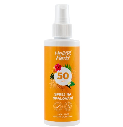 • Helios Herb Sprej na opalování s ochranným faktorem 50 chrání pokožku před spálením sluncem a škodlivým UVA i UVB zářením. Prodlužuje dobu bezpečného pobytu na slunci až padesátkrát. Použití: PŘED POUŽITÍM PROTŘEPAT! Naneste na suchou pokožku 30 minut před opalováním vždy v dostatečném