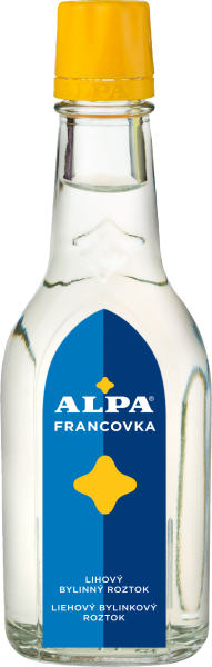 Skladem Alpa Francovka, 160 ml PeMi kód: 522154 EAN: 85911093 Obsahuje 60 % alkoholu, lihový roztok přírodních rostlinných silic a některých jejich obsahových látek (mentolu, linaloolu, nerolu aj.). Obsahuje 60 % alkoholu. Vhodná pro dezinfekční a hojivé účinky , které ulevují při chřipce a nachlazení, zmírňují bolesti hlavy a 52 Kč Do košíku