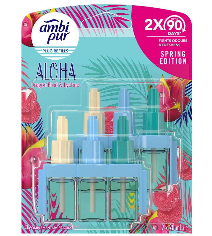 Skladem AmbiPur 3vol NN (2x20ml/BLI) Aloha PeMi kód: 746348 EAN: 8700216776134 Ambi Pur 3volution náhradní náplň do osvěžovače vzduchu Aloha 2x20 ml Dragon Fruit & Lychee s technologií OdourClear nepřekrývá, ale skutečně eliminuje nepříjemné vytrvalé pachy a zanechává lehkou svěží vůni až 90 dnů (pokud se používá 12 hodin denně při nastavení nejnižší úrovně odpařování) 241 Kč Do košíku