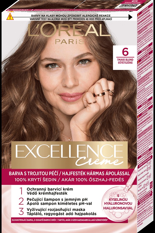 Skladem Excellence barva 6.0 Tmavá Blond PeMi kód: 744210 EAN: 3600524264437 Permanentní barva obohacená o ochranné složky. Dlouhotrvající barva Bohatá přirozená barva Zářivé a pružné vlasy plné života 100% krytí šedin. L'Oréal Paris Excellence přináší rituál barvení s trojí ochranou obohacený o kyselinu hyaluronovou, který se stará o vaši barvu, pokožku hlavy i 227 Kč Do košíku