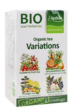 • Apotheke BIO čajové variace je směs ovocných a ovocno-bylinných čajů porcovaných v nálevových sáčcích. BIO ovocné čaje se užívají k doplnění pitného režimu. U přípravků je možné doložit původ bylin, nepoužívají se umělá hnojiva a pesticidy, nad výrobky má dozor certifikační organizace