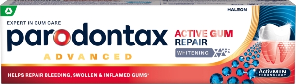 Skladem Parodontax Active Gum Repair Whitening zubní pasta pro dásně a bělení, 75 ml PeMi kód: 745104 EAN: 5054563275424 Parodontax Active Gum Repair Whitening zubní pasta je určena pro péči o dásně a bělejší vzhled zubů. 140 Kč Do košíku