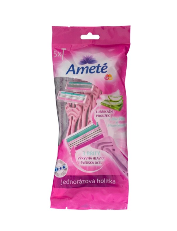 Skladem Ameté jednoráz holítka 3 břité(5ks/sac) PeMi kód: 739062 EAN: 8590273638595, 8590273642547 Dámská jednorázová holítka se 3 břity, výkyvnou hlavou a se zvlhčujícím proužkem pro hladké a jemné oholení. 93 Kč Do košíku