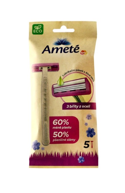 Skladem Ameté holítka eco 3 břité (5ks/sac) PeMi kód: 739063 EAN: 8590273639417, 8590273642585 Tříbřité holící strojky s ručkami z bio materiálu. Obsahuje zvlhčující pásek s Aloe vera pro mimořádně jemné oholení. • Snížení plastového odpadu až o 60% • Ručka obsahuje 50% pšeničné slámy • 3 břity z oceli • Lubrikační pásek s extraktem z aloe vera 59 Kč Do košíku