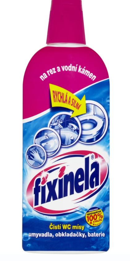 • Fixinela 500 ml odstraňuje rez a vodní kámen s extrémní silou a rychlostí. Tekutý kyselý čistič na WC mísy, umyvadla, vany, obklady, vodovodní baterie. Účinně čistí, ničí bakterie, rozpouští vodní a močový kámen, odstraňuje rez a další usazeniny