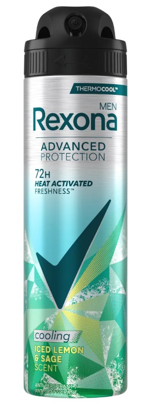 • Rexona MEN antiperspirant sprej Iced Lemon & Sage Scent přináší intenzivní chladivý efekt díky inovativní ThermoCool™ technologii, která se aktivuje při pohybu. Osvěžující vůně zelených listů a limetky vytváří příjemný pocit svěžesti během celého dne