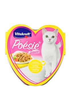 • Poésie Mousse od značky Vitakraft – kompletní krmivo s kuřecí příchutí pro dospělé jedince všech velikostí a plemen. Uvnitř konzervičky čeká paštika ve formě delikátní pěny, která zachutná každé kočce. Je vyrobená z masa a obsahuje minerální látky