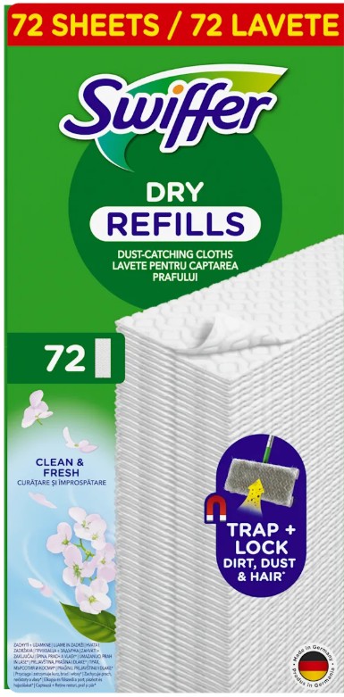 Skladem 491 ks. Swiffer náhradní čisticí ubrousky na podlahu suché, 72 ks parfémované PeMi kód: 742650 EAN: 8006540802403 suché prachovky na násadu Sweeper, zachytí 3 typy nečistot: prach, špínu a chlupy - elektrostatický účinek - rychlý a snadný úklid - pro všechny tvrdé povrchy Swiffer náhradní čisticí ubrousky na podlahu se používají s násadou Sweeper 275 Kč Do košíku