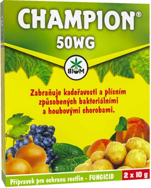 Skladem Fungicid Champion Biom přípravek pro ochranu rostlin 50WG, 10 g PeMi kód: 711474 EAN: 8595078517113 Champion 50 WG je kontaktní fungicidní a baktericidní přípravek k ochraně proti houbovým a bakteriálním chorobám rostlin a k ochraně květů meruněk proti mrazu. Rozsah a způsob použití: Postřikem podle dané choroby - viz. níže 30 Kč Do košíku