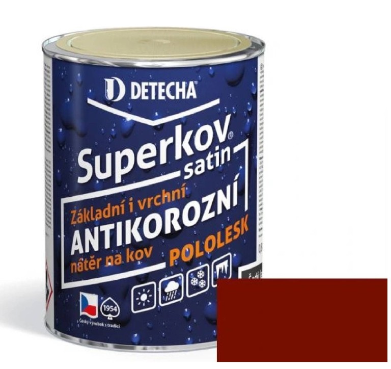 Skladem Detecha Superkov základní i vrchní barva na kov, červenohnědá mat, 5 kg PeMi kód: 521163 EAN: 8595002316218 Základní i vrchní antikorozní syntetická nátěrová hmota určená k povrchové úpravě kovových materiálů a k jejich účinné ochraně proti vzniku koroze. 1 503 Kč Do košíku