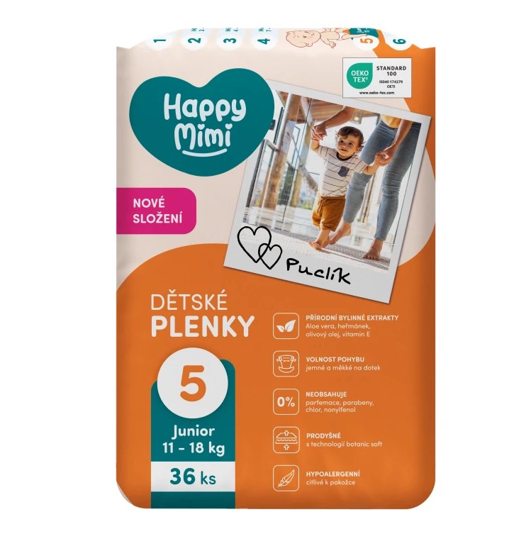 Skladem Happy Mimi Dětské plenky 5, 36 ks PeMi kód: 732541 EAN: 8590273647153 Happy Mimi – Nové dětské plenky s přírodní péčí Objevte nové jednorázové plenky Happy Mimi s inovativním složením, které spojuje jemnost, bezpečí a přírodní sílu bylin. Díky extraktům z Aloe vera, heřmánku, olivového oleje a vitaminu E poskytují šetrnou péči dětské pokožce 186 Kč Do košíku