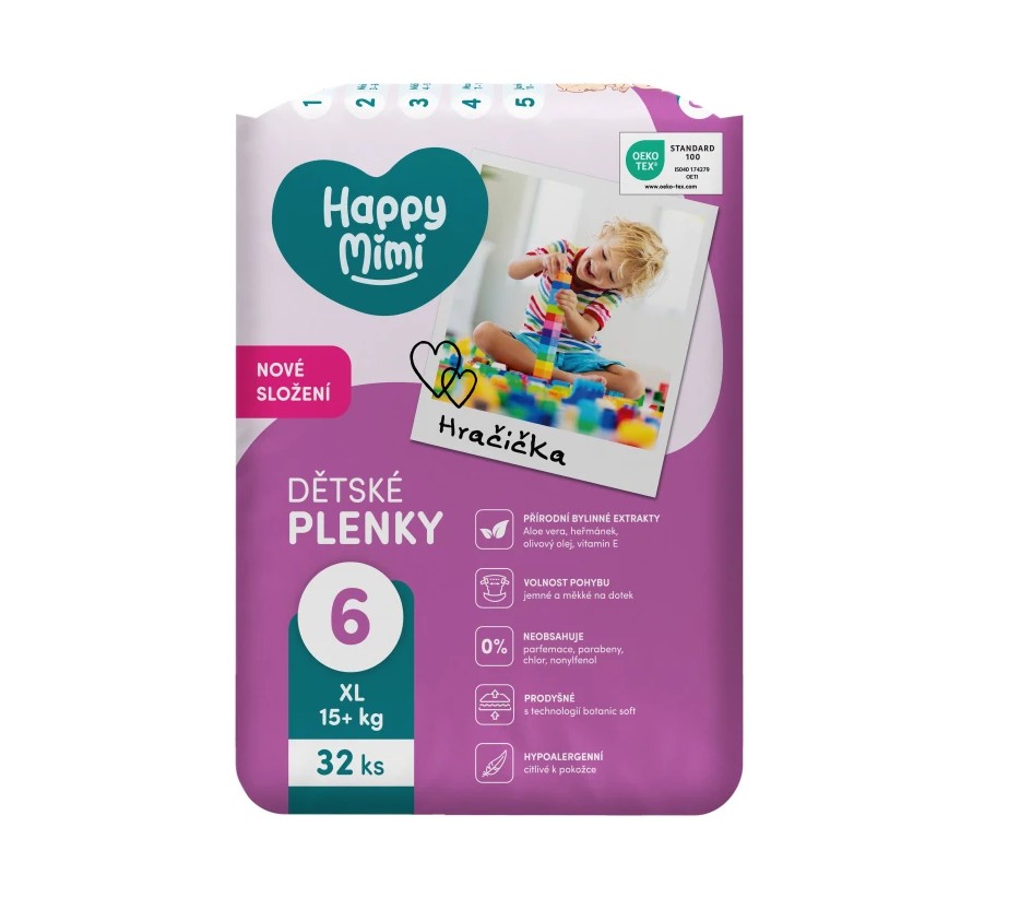 Skladem Happy Mimi Dětské plenky 6 XL, 32 ks PeMi kód: 732613 EAN: 8590273647160 Happy Mimi – Nové dětské plenky s přírodní péčí Objevte nové jednorázové plenky Happy Mimi s inovativním složením, které spojuje jemnost, bezpečí a přírodní sílu bylin. Díky extraktům z Aloe vera, heřmánku, olivového oleje a vitaminu E poskytují šetrnou péči dětské pokožce 226 Kč Do košíku