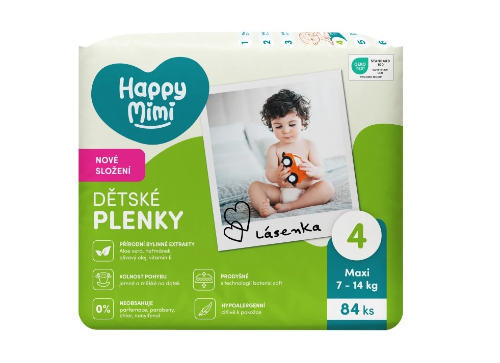 Skladem Happy Mimi Dětské plenky JUMBO 4 Maxi, 84 ks PeMi kód: 734122 EAN: 8590273647191 Happy Mimi – Nové dětské plenky s přírodní péčí v ekonomickém velkém balení Objevte nové jednorázové plenky Happy Mimi s inovativním složením, které spojuje jemnost, bezpečí a přírodní sílu bylin. Díky extraktům z Aloe vera, heřmánku, olivového oleje a vitaminu E poskytují šetrnou péči dětské 341 Kč Do košíku