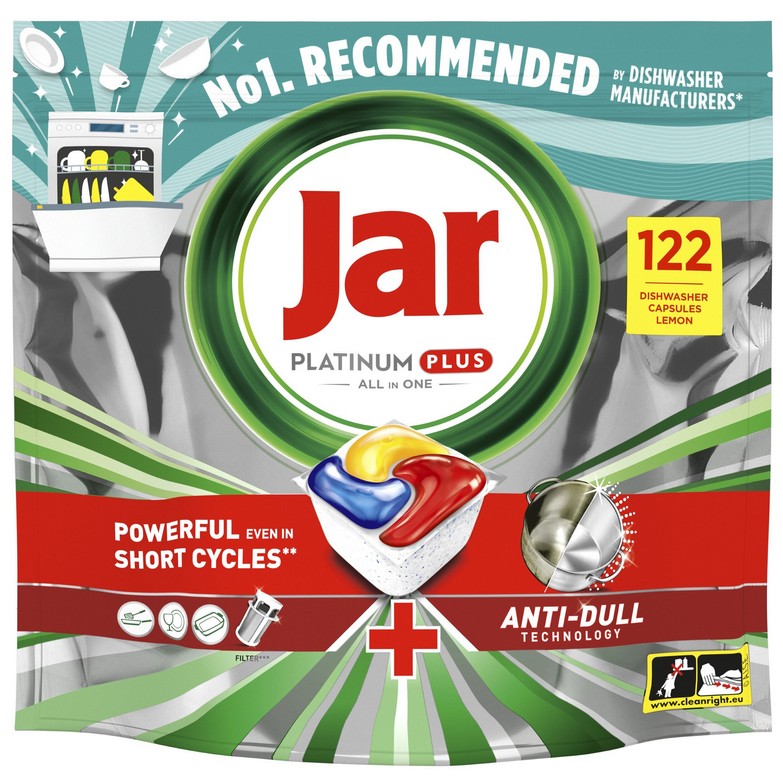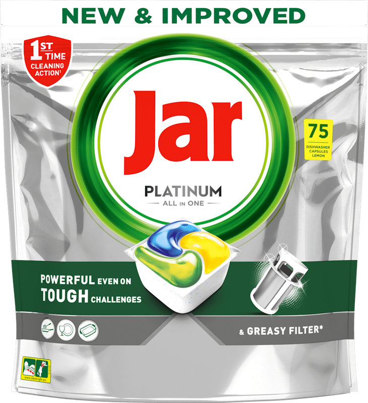 Skladem Jar Platinum Plus Deep Clean 102 kapslí PeMi kód: 691175 EAN: 8700216253659 Kapsle Jar Platinum Plus All In One do automatické myčky nádobí zanechávají nádobí čisté jako nové a mají nejlepší čisticí účinky Jaru na odolné zbytky jídla. Pomáhají dokonce odstraňovat zašedlost vznikající časem a obnovují původní lesk nádobí. 1 032 Kč Do košíku
