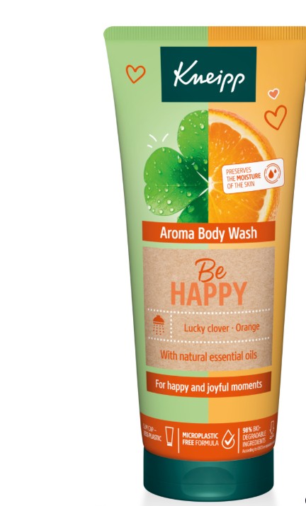 • Povzbudivá vůně jetele a pomeranče vystřelí vaši náladu do oblak. Stačí s sebou vzít do sprchy aroma gel Kneipp Be Happy s přírodním složením a pokožka i nálada září štěstím. Aroma sprchový gel pečuje o kožní mikrobiom a vědecké studie navíc potvrdily jeho hydratační účinky