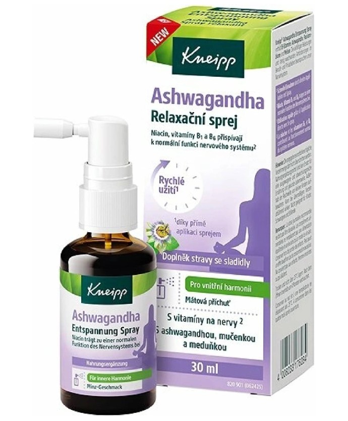 • Ashwagandha Spray - Relaxační sprej Tento relaxační ústní sprej podporuje duševní pohodu a pomáhá harmonizovat nervovou soustavu. Obsahuje vitaminy skupiny B, ašvagandu, mučenku a meduňku, které přispívají k vnitřní rovnováze a lepší koncentraci