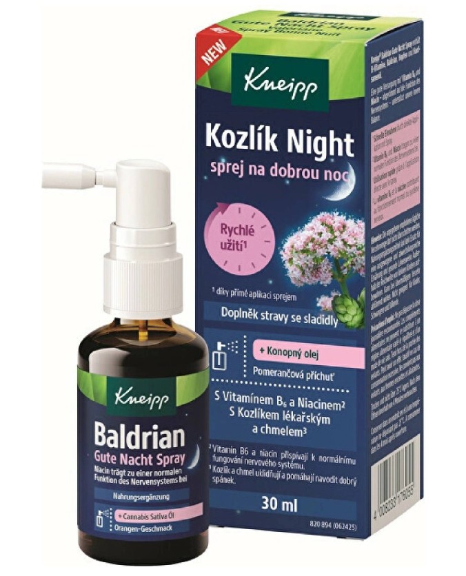 • Kozlík Night Spray - Sprej na dobrou noc Ústní sprej Kozlík Night podporuje klidný spánek a hluboký odpočinek. Obsahuje kozlík lékařský, chmel, konopný olej a vitaminy skupiny B, které harmonizují nervový systém a usnadňují usínání