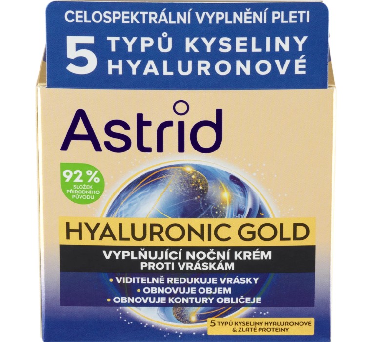 Skladem Astrid Hyaluronic Gold noční pleťový krém, 50 ml PeMi kód: 716172 EAN: 8592297012030 Astrid Hyaluronic Gold – vyplňující noční pleťový krém (50 ml) Noční rituál pro zralou pleť: krém s 92 % přírodních složek a pokročilým 5D hyaluronovým komplexem, navržený pro regeneraci, hloubkovou hydrataci a vyhlazení během spánku 311 Kč Do košíku