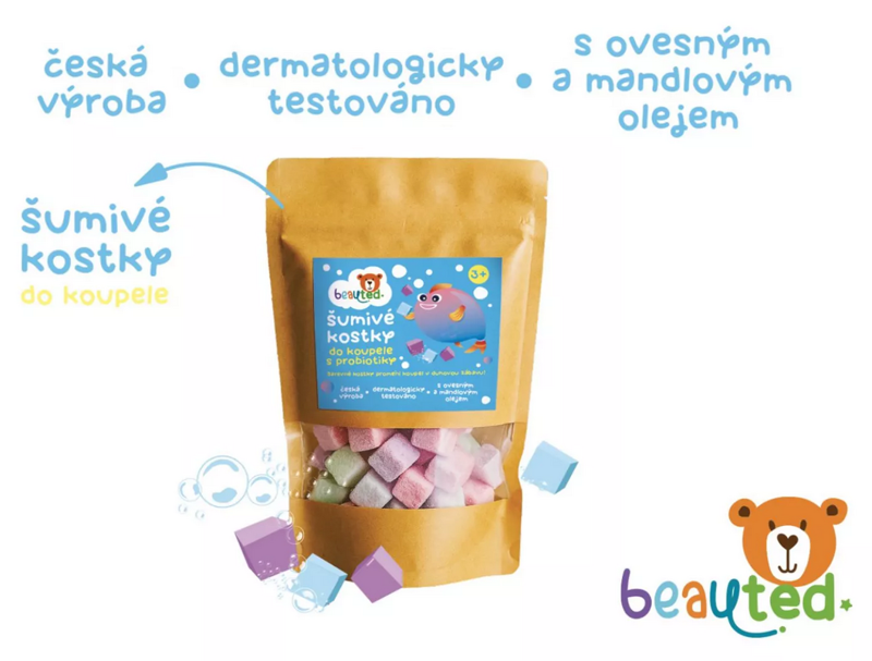 • Proměňte koupel v barevné dobrodružství. Šumivé kostky beauted se postarají o zábavu i jemnou péči o dětskou pokožku. Obsahují probiotika podporující přirozenou ochranu pokožky. Obohaceny o minerály z mořské soli, ovesný extrakt a mandlový olej. Dermatologicky testováno – šetrné k dětem