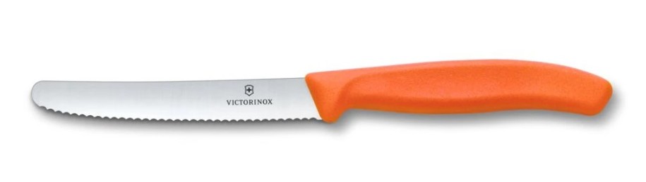 Dodání do 5 pracovních dnů nůž na rajčata 11cm oranžový VICTORINOX PeMi kód: 737917 EAN: 7613329191514 Kuchyňský nůž na rajčata 11 cm, oranžový – Lehce si poradí s rajčaty, ovocem i další zeleninou s tenkou slupkou. Vlnkované ostří z nerezové oceli jemně prořízne bez mačkání, kulatá špička zajišťuje bezpečnější použití. Pohodlné držení zajišťuje ergonomická plastová rukojeť 195 Kč Do košíku