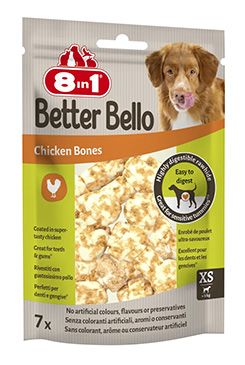 Skladem Pochoutka 8in1 Better Bello Chicken Bones XS 84g/7ks PeMi kód: 722084 EAN: 4048422189480 Doplňkové krmivo pro dospělé psy. Kuřecí kosti 8v1 Better Bello Chicken Bones XS jsou vyrobené z vysoce stravitelného kolagenu ze surové kůže. Díky tomu jsou opravdu odolné a dlouho vydrží, ale na rozdíl od tradičních žvýkacích pochoutek ze surové kůže jsou lépe stravitelné, a proto jsou 75 Kč Do košíku