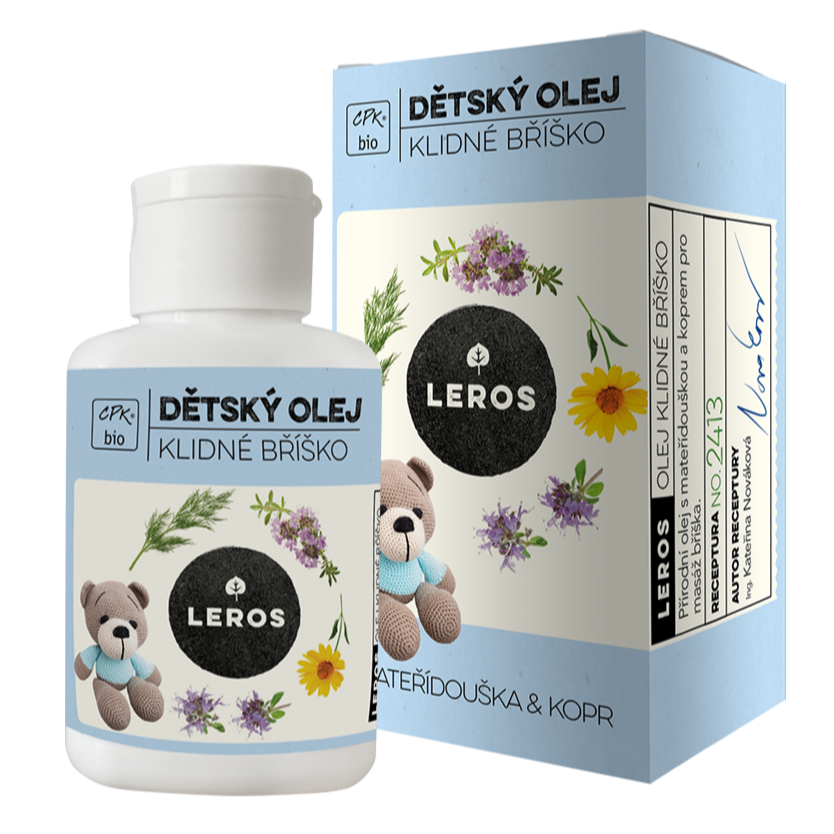 • LEROS Dětský olej na klidné bříško BIO je přírodní poklad, který nabízí vašemu dítěti jemnou péči a úlevu. Tento vyvážený olej kombinuje blahodárné účinky mateřídoušky, měsíčku a kopru, které jsou proslulé svou schopností uvolňovat bříška a zmírňovat svalové napětí