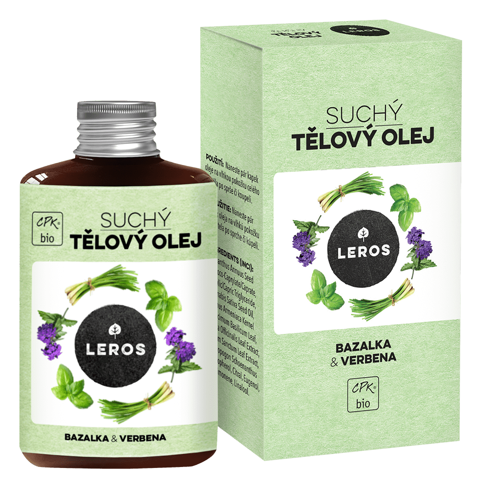 • LEROS Suchý tělový olej BIO s vůní bazalky a verbeny je přírodní poklad, který se okamžitě vstřebává do pokožky, zanechává ji hedvábně hladkou a dokonale vyživenou, a to bez pocitu mastnoty. Tento lehký olej poskytuje hlubokou hydrataci díky meruňkovému oleji a bazalkovému macerátu, které