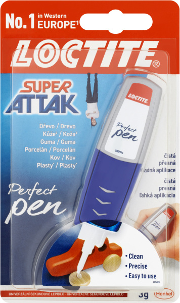 • Loctite Perfect Pen je jednosložkové gelové vteřinové lepidlo v obalu ve tvaru pera, které se pohodlně stlačí a zabezpečí přesnou aplikaci lepidla. Gelová receptura zabrání stékaní lepidla a je vhodná také na svislé aplikace